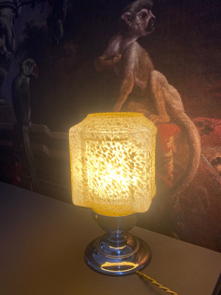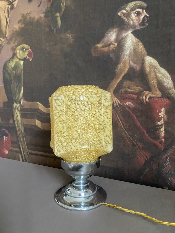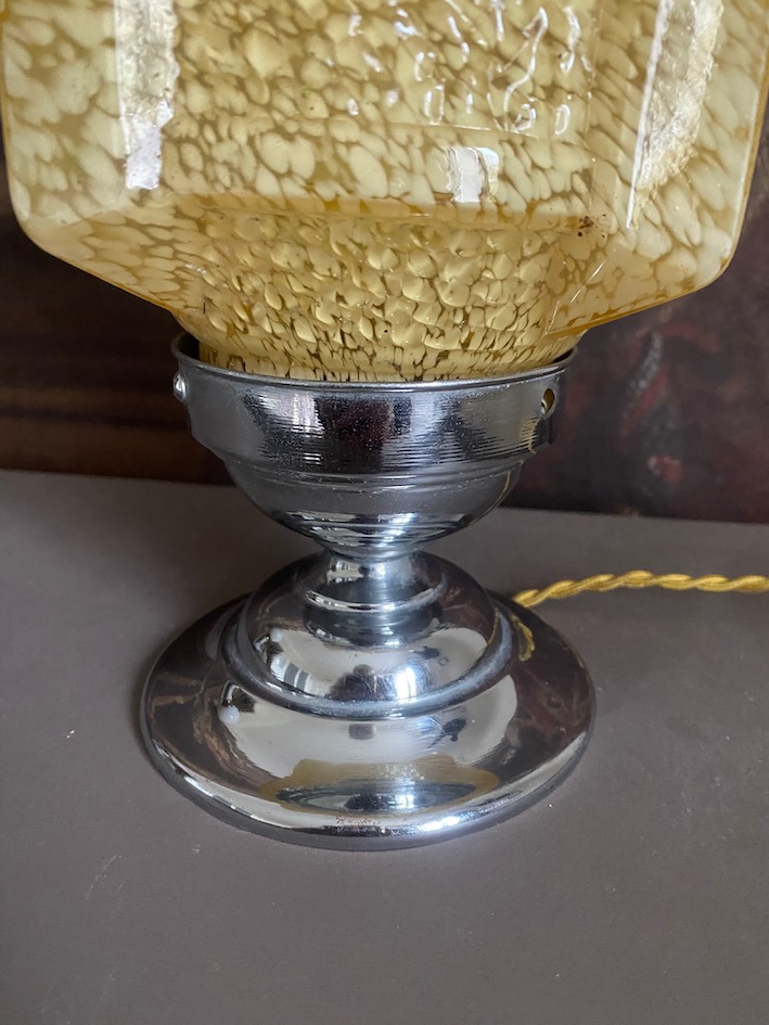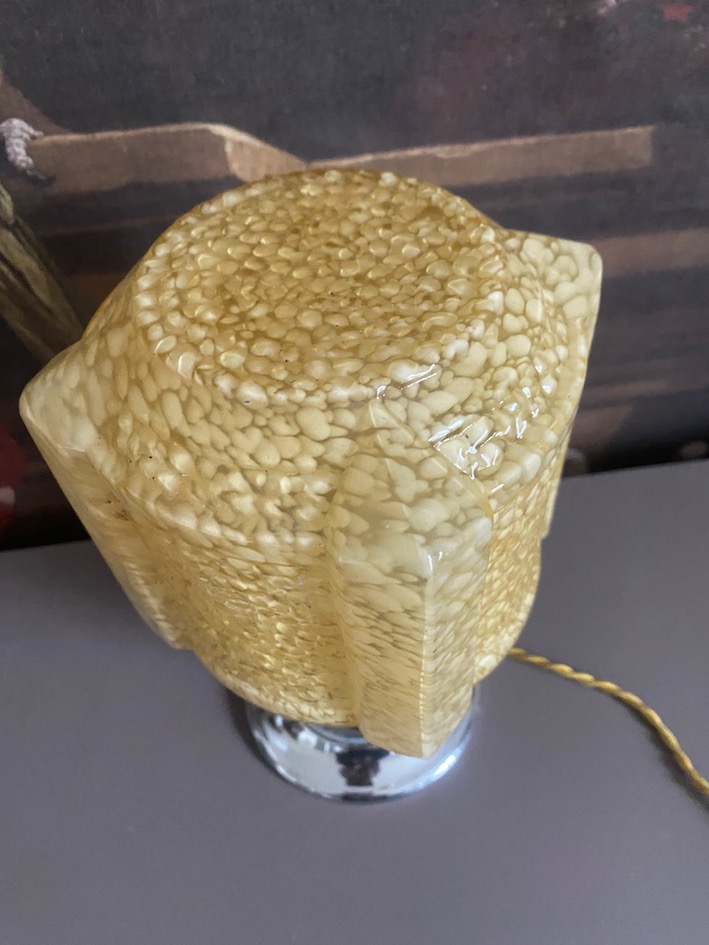 Le verre en opaline jaune moucheté est facetté et travaillé comme un dôme.