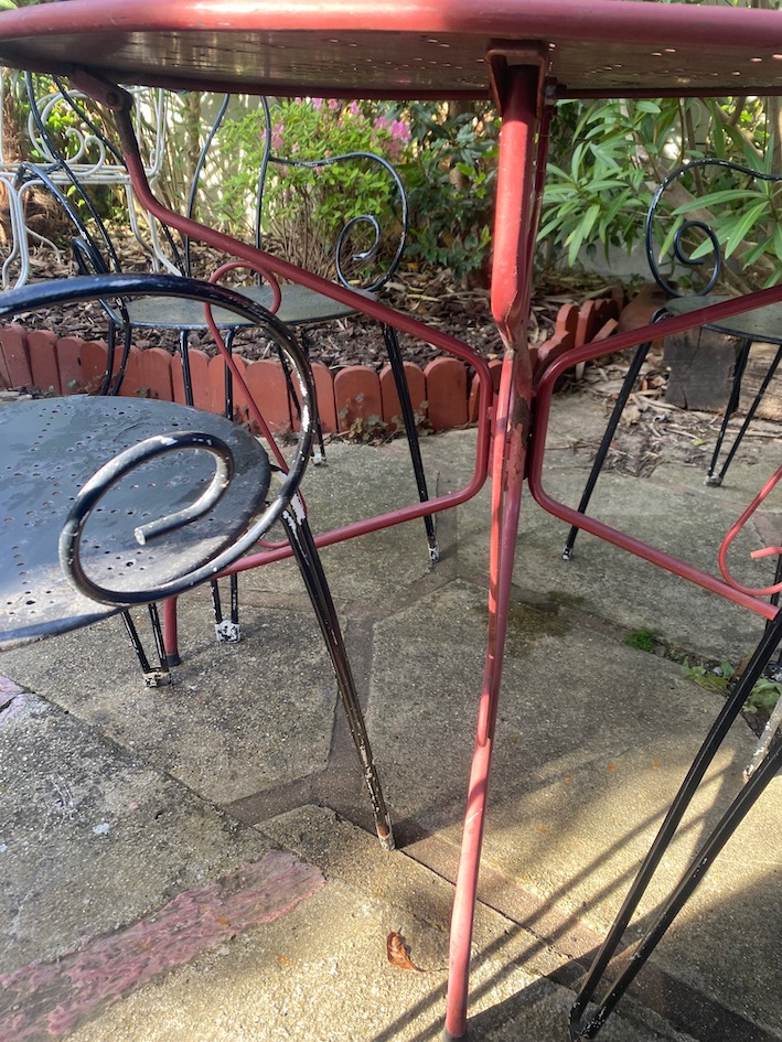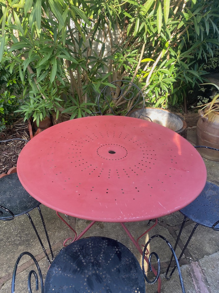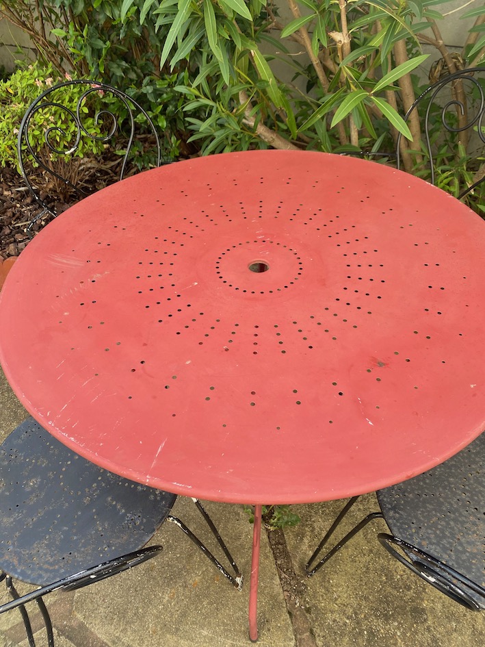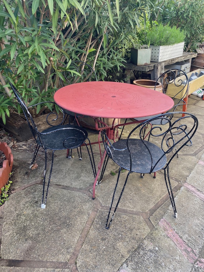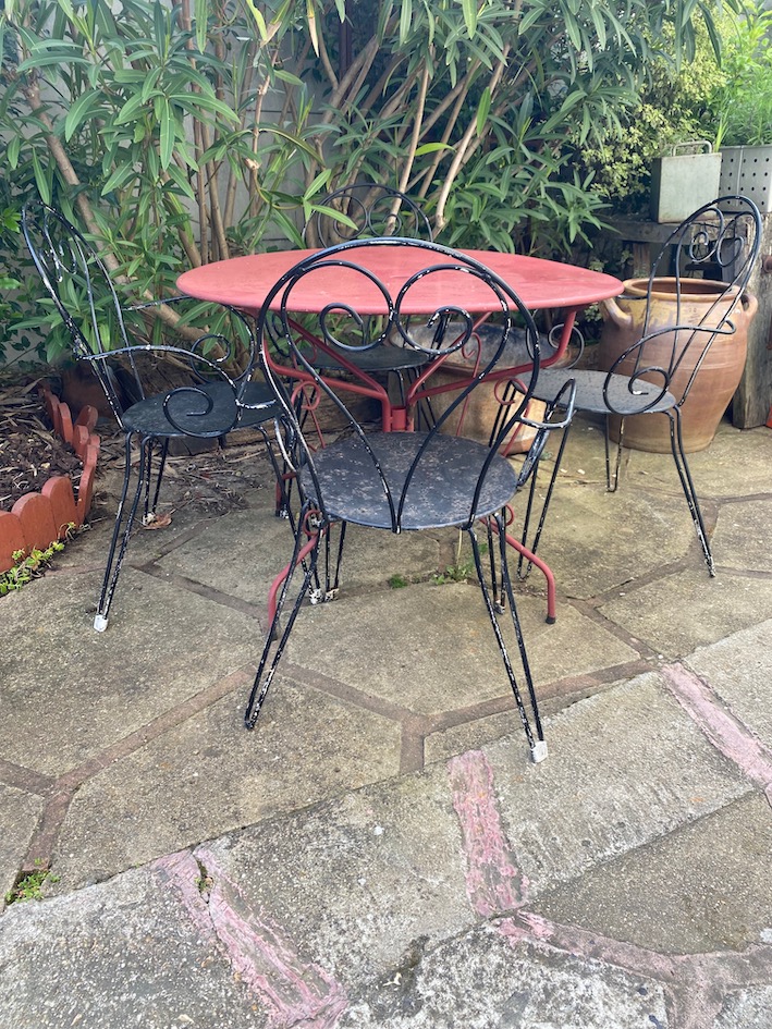L’ensemble est en bon état, la table rouge et les chaises noires