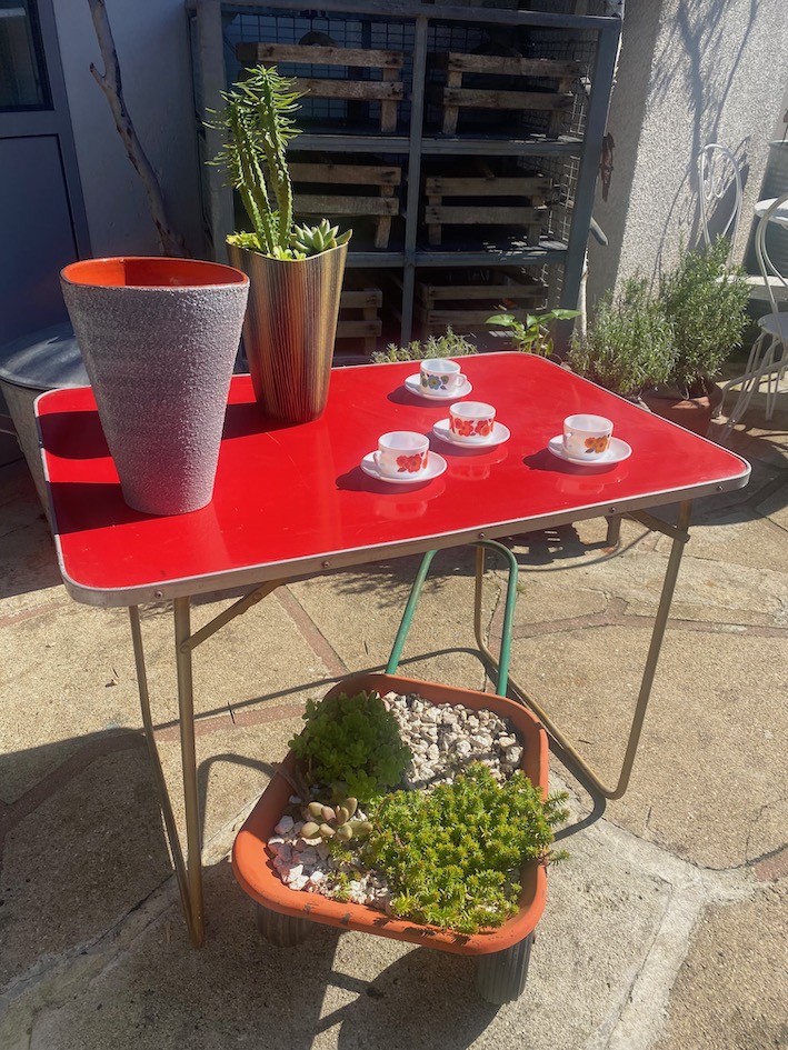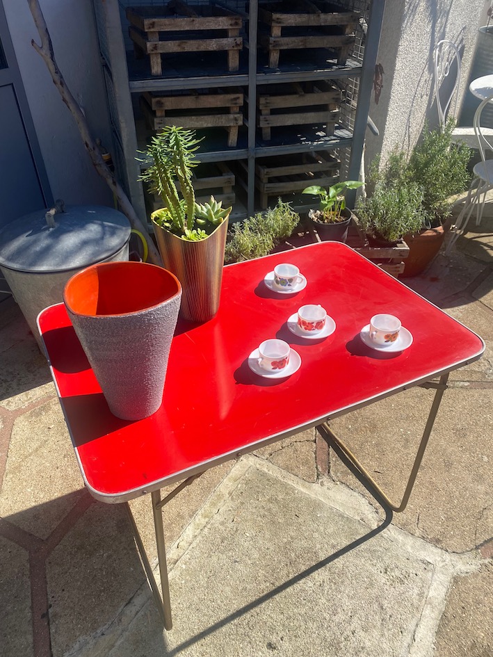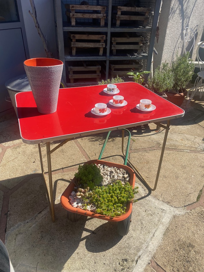 Le plateau est en formica rouge, les pieds sont pliants